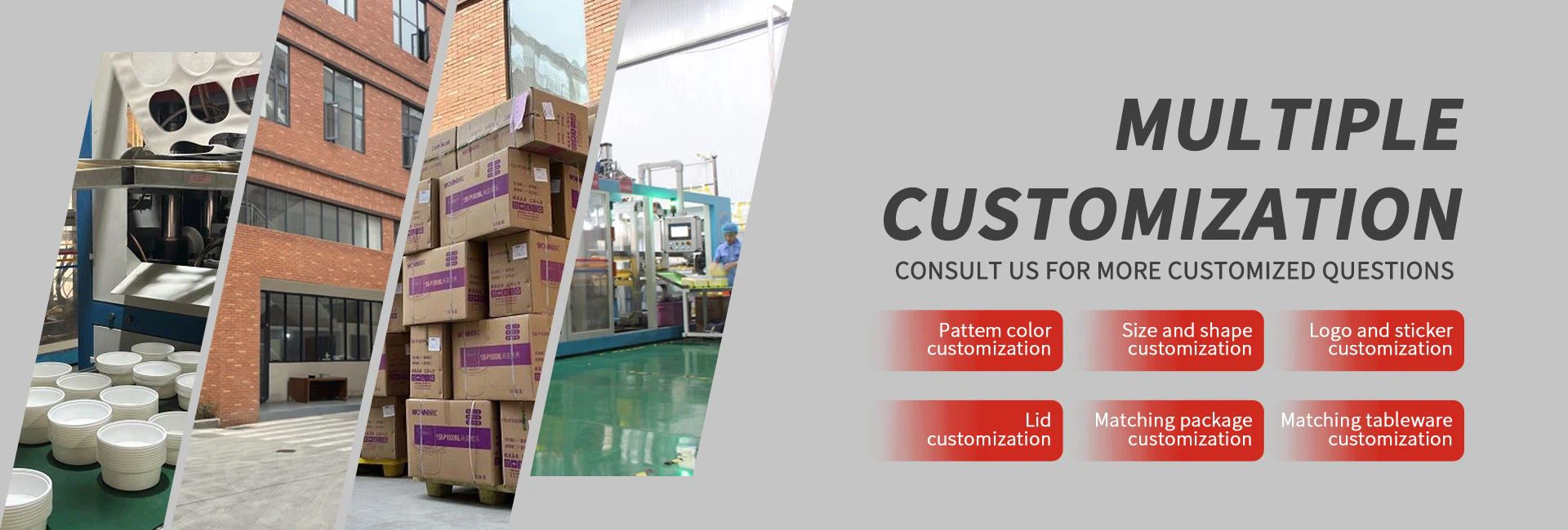 Saját gyárunk van, és különféle típusú és anyagú élelmiszer-tartályokat gyárthatunk. Az egy rekeszből a többrekeszes formába különféle eldobható edényeket is forgalmaznak, például leveses tálat, tálcát, csészét, szósztartót, biológiailag lebomló kukoricakeményítőt, cukornádat, ételes dobozokat, szívószálakat stb.